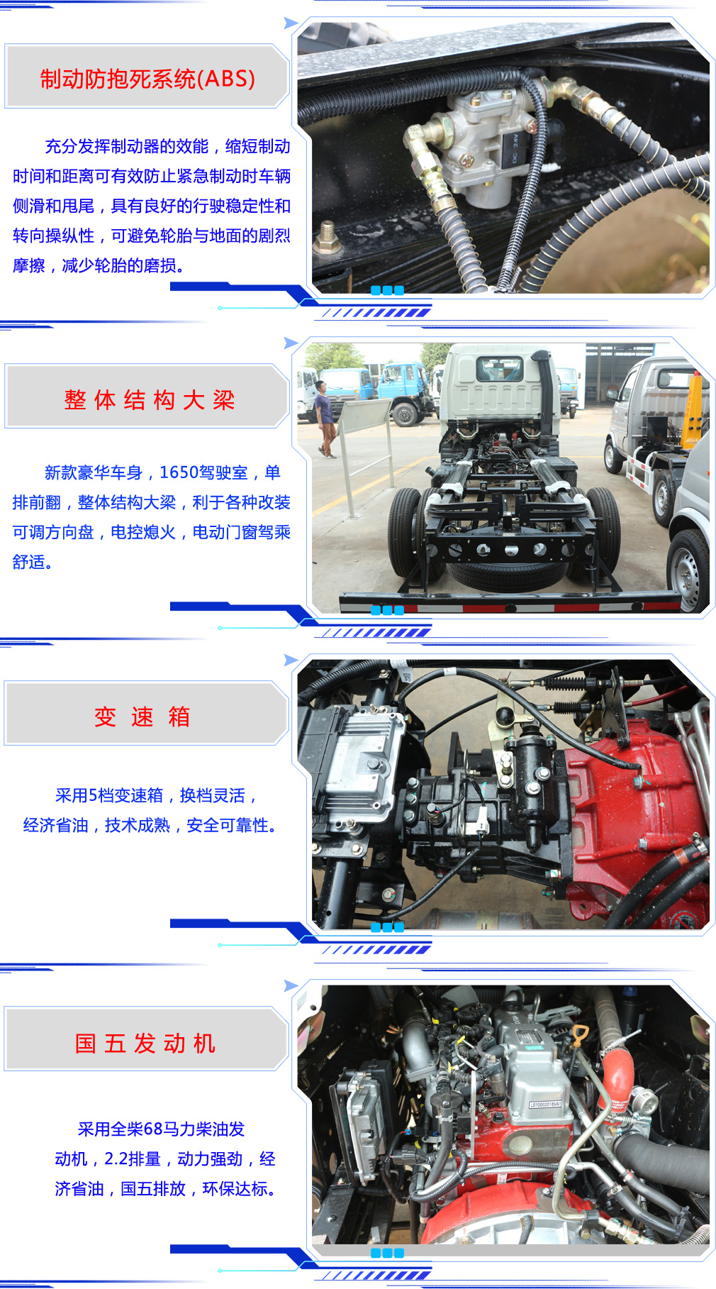 | 其他 | 1,介質:液態(tài)污物和糞便,密度:800千克/立方米,罐體有效容積:2.07立方米,罐體外形尺寸(長×長軸×短軸)(mm): 2600×1300×900。2,防護材料:Q235A,連接方式:側防護與副梁焊接連接,后防護與車架焊接連接,后部防護斷面尺寸(mm):200×50,后部防護離地高度(mm):500。3,ABS系統(tǒng)控制器型號:YF8,ABS系統(tǒng)控制器生產(chǎn)企業(yè):武漢元豐汽車電控系統(tǒng)有限公司。4,車輛顏色,文字噴涂及局部細節(jié)可變化。 | ||